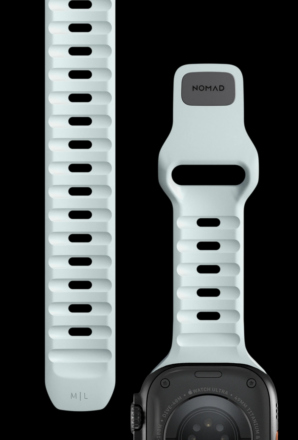 Introducing the Nomad Sport Band in Icy Blue Glow, a limited edition accessory that combines style and functionality. Crafted from durable FKM fluoroelastomer rubber, it offers a comfortable fit with interior ventilation channels. The innovative Glow 2.0 technology ensures a striking blue luminescence in low-light conditions.