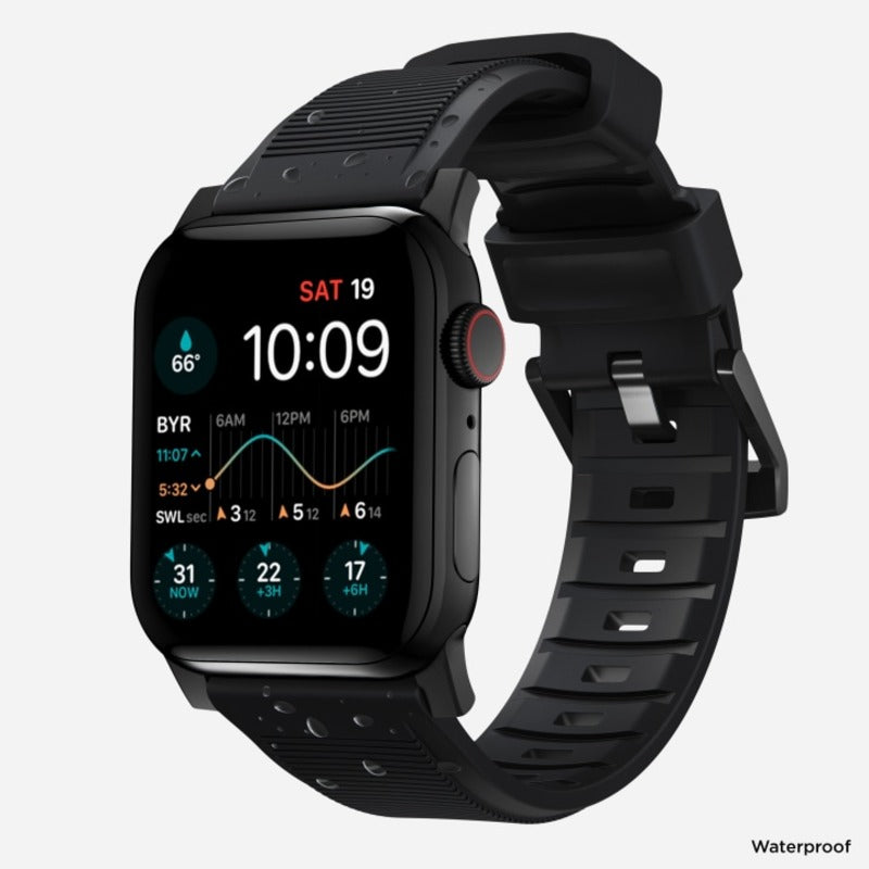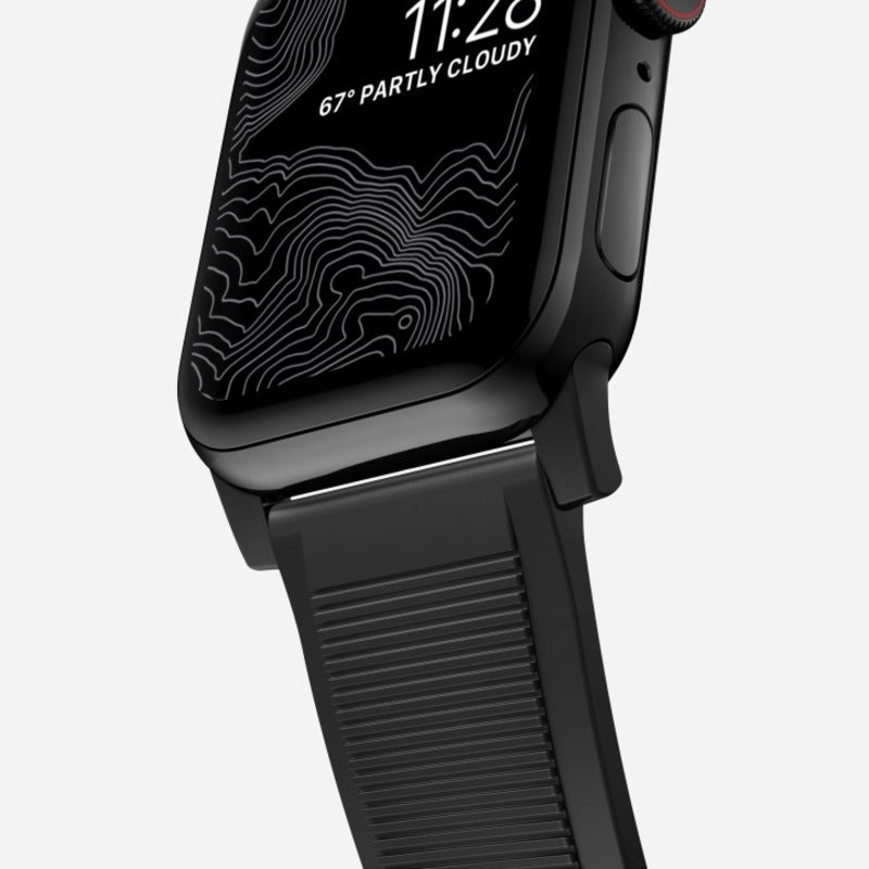 Designed to give your Apple Watch a modern, rugged look for daily wear or on your next adventure. Rugged Band is constructed from FKM, a soft yet strong fluoroelastomer that combines all-day comfort with lasting durability. Custom-designed, injection-molded stainless steel hardware provides a secure fit and unique style.
