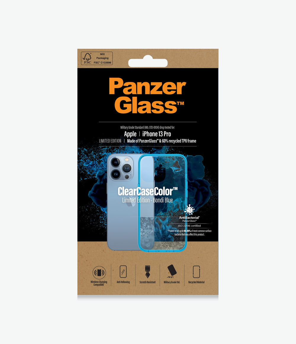 ClearCaseColor™ - All cases are now labelled military grade standard. AntiBacterial PanzerGlass™– Proven to kill up to 99.99% of most common surface bacteria that may affect this product. Express yourself ClearCaseColor™ is a strong fashion statement and gives you the opportunity to express yourself in any and every environment and social setting. We have combined fashion, sustainability and incredible protection in one product. We’ve raised the bar for sustainable fashionable protection against damage from drops. The brand new ClearCaseColor™ are identical with the iMac’s 1999 lineup of translucent computers: Bondi Blue, Grape, Tangerine, Lime and Strawberry. Features Military grade standard Antibacterial (certified JIS 22810-ISO 22196) Scratch resistance Compatible with wireless charging 60% recycled TPU frame Anti-Yellowing Full access to all functions Weather resistant Easy snap on/off Available colors: Bondi Blue, Grape, Tangerine, Lime and Strawberry.