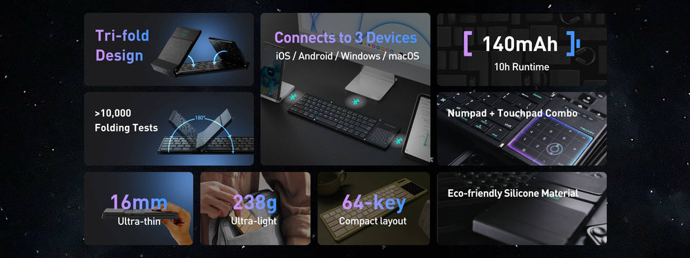 Stay productive on the go with this ultra-portable, foldable Bluetooth keyboard. Designed for digital nomads, remote workers, students, and travelers, this compact keyboard unfolds into a full 64-key layout with an integrated multi-gesture trackpad and numeric keypad—all in a design that folds down small enough to fit in your pocket or tech pouch.