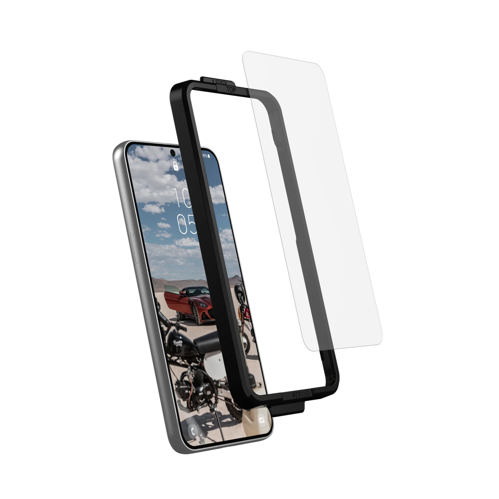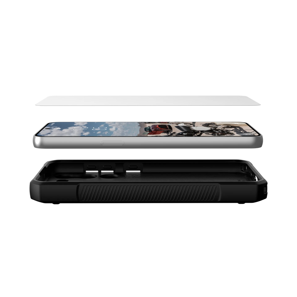 Our Glass Shield Plus Premium screen protectors are built to withstand daily use and then some. The Glass Shield Plus protects your display from scratches and abrasions from the most demanding environments and biggest drops. Made with double-strengthened tempered glass, our ultra-thin (0.33mm) construction delivers responsive precision touch sensitivity, and pristine HD surface clarity. A nanometer AR coating minimizes glare making it easy to use your phone in bright environments - like the great outdoors. A special oleophobic coating repels natural skin oils, limiting fingerprint and smudge build up that can compromise image resolution. The precise fit with edge-to-edge coverage is compatible with all UAG cases. Quickly and easily apply the screen protector at home with our included applicator kit, and maintain its shine with the included cleaning kit. With our Glass Shield Plus Premium Screen Protector, your screen will always look clean, respond to your touch accurately, and deliver strong everyday protection. Couple our tempered glass screen shields with one of our cases to experience unparalleled protection on all your adventures.