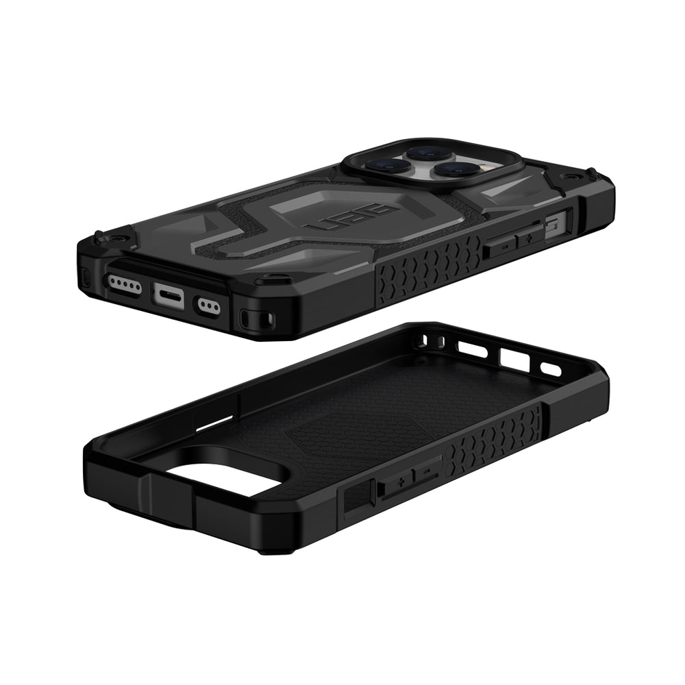 The quintessential, all-terrain, rugged protective case now available with built-in MagSafe module. Monarch Pro is equipped with premium materials for premium protection. Starring 5-layers: a shock-resistant core, an unmistakable signature armor frame, layered with carbon fiber/leather, a polycarbonate shear plate, alloy metal hardware, and impact-resistant rubber surround. Seamless MagSafe charging compatibility. Uncompromised and classic Urban Armor Gear DNA built to go further.